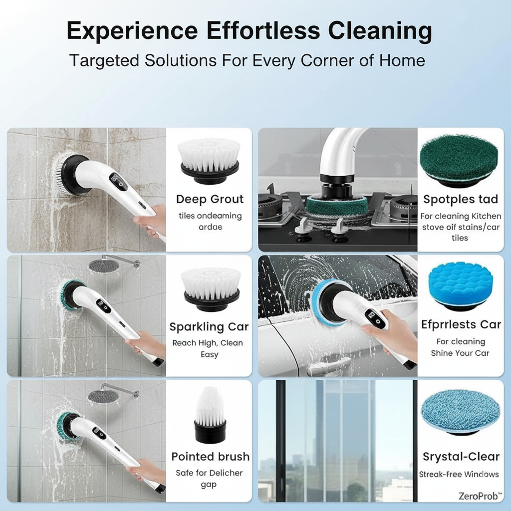 9 Replaceable Brush Heads: Designed for various surfaces like tiles, sinks, bathtubs, floors, and glass.